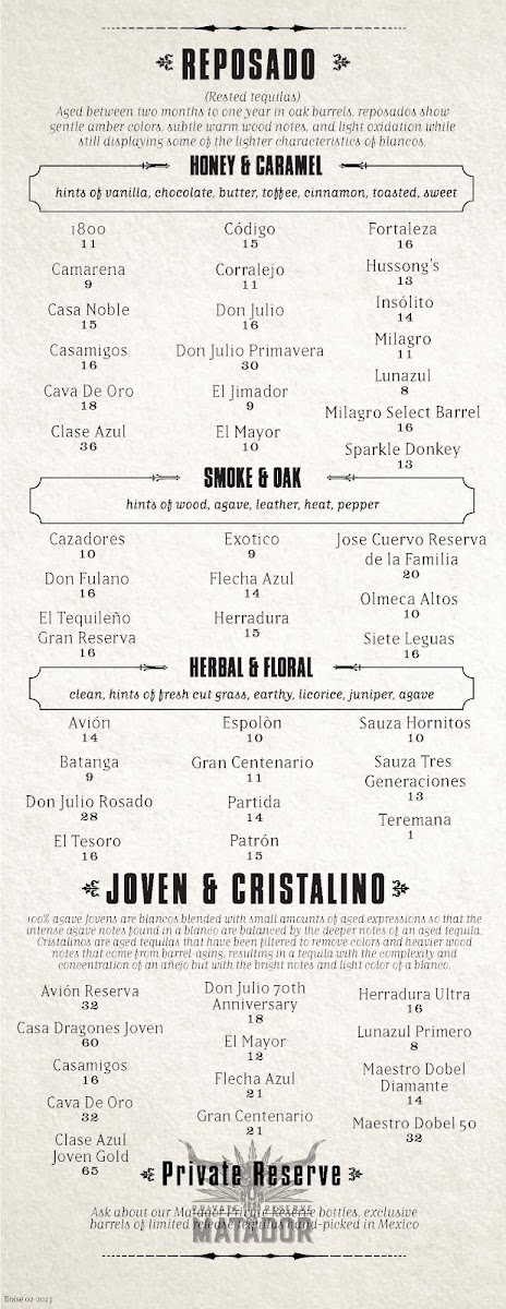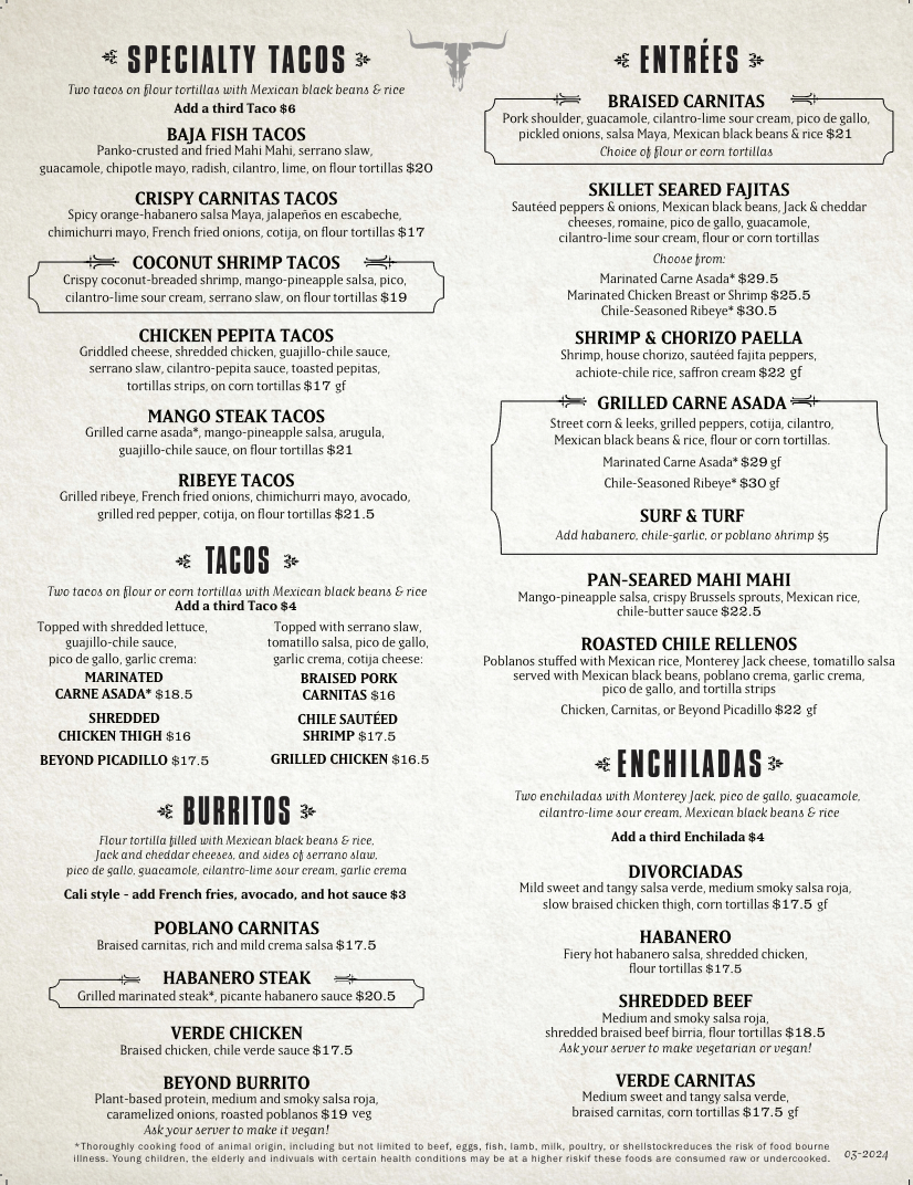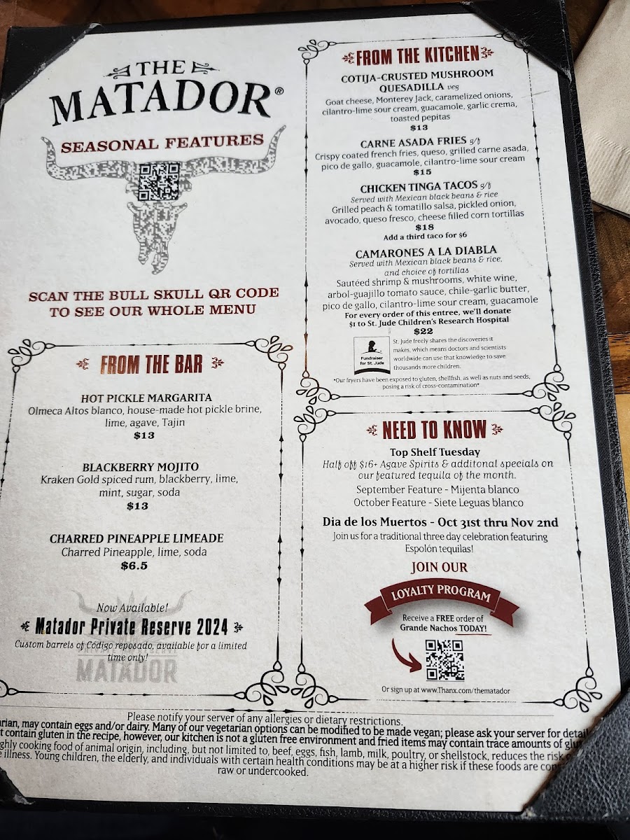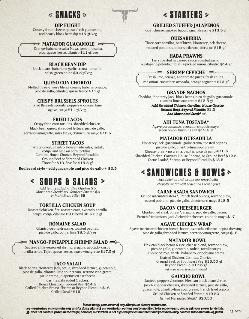 The menu at Matador Redmond features a variety of traditional Mexican dishes alongside a selection of beverages and bar options. It is structured to accommodate different dining preferences, offering items suitable for casual meals, happy hour bites, and group dining.